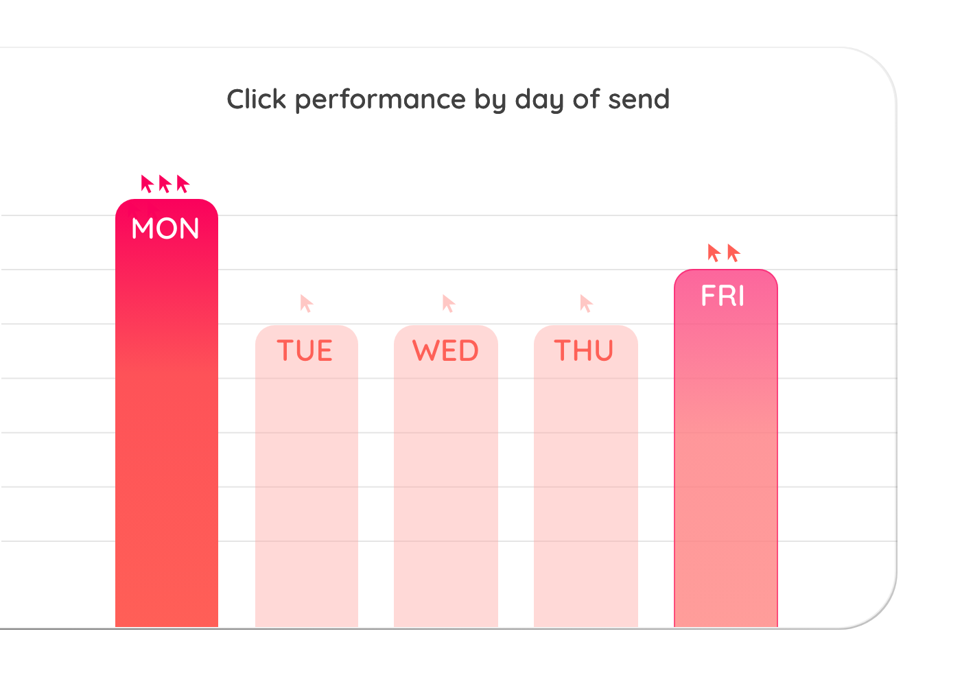 Monday campaigns deliver around 45% more clicks than midweek sends. Friday also outperforms the average.