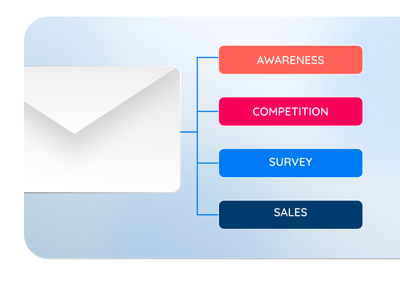 Use awareness to build familiarity, surveys to drive interaction, and sales once trust is in place.